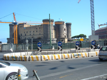 Questa rotonda attualmente non esiste più, dal momento che l’intera piazza è sotto lavori per scavi archeologici. L’inquadratura del film è dall’alto, probabilmente da una delle finestre del Teatro Mercadante o del Tribunale amministrativo regionale (TAR) lì a fianco; e inquadra dapprima il Maschio Angioino (prima inquadratura) e successivamente il Palazzo S.Giacomo sede del Municipio (seconda inquadratura).