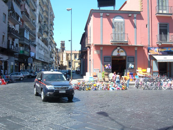 Tale piazza tuttavia non si trova nell’elenco stradale attuale di Napoli. E’ forse probabile che sia un nome inventato. Il dato di fatto è che l’inquadratura riservata alla volante che si sta recando presso l’abitazione di Manomozza è da Piazza del Carmine in direzione di Piazza Mercato. In quest’area (Piazza del Carmine e Piazza Mercato) si trovano 3 chiese molto imponenti, ma solo quella di Sant’Eligio Maggiore si nota, defilata, sullo sfondo. Questa chiesa è peraltro la più caratteristica e affascinante e qui trovate una immagine più ravvicinata.